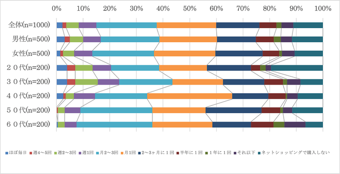 普段、ネットショッピング(ネット通販)で購入している頻度を聞いたところ、30代の23.5%が「週1回以上」購入していると回答し、他の年代と比べて多いことが分かりました。