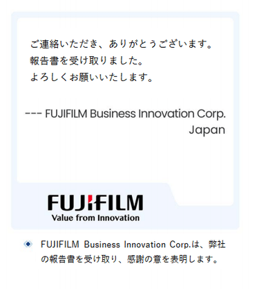 「ご連絡いただき、ありがとうございます。報告書を受け取りました。よろしくお願いいたします。」