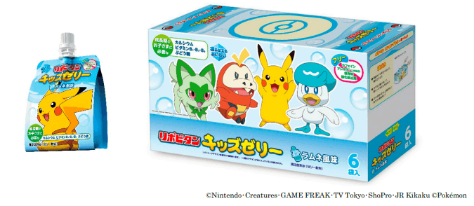 『リポビタンキッズゼリー』は、成長期のお子さまに必要な栄養素であるビタミンB1・B2・B6、カルシウムを配合した清涼飲料水(ゼリー飲料)です。エネルギーとなるぶどう糖を配合している他、熱中症対策※1にもおすすめです。保存料・酸化防止剤・アレルゲン(28品目)・カフェインの全てがフリーで、お子さまのことを考えた設計となっています。『リポビタンキッズゼリー』は、2021年1月にTVアニメ「ポケットモンスター」のイラストパッケージのぶどう風味(無果汁)を発売して以来、風味の追加やパッケージに描かれている「ポケットモンスター」のイラストデザインの変更などを行い、お子さまを応援してまいりました。