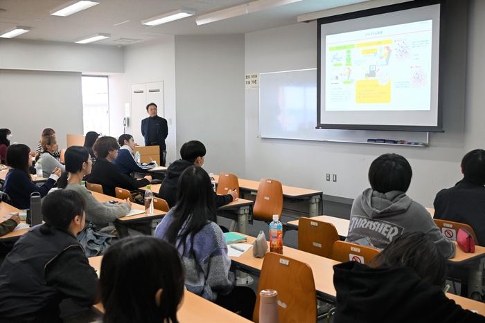 講演に先立ち、山岡教授より山並氏の多岐にわたるキャリアが紹介され、「学生の皆さんの将来の参考になるお話をぜひ聞いてください」と挨拶がありました。