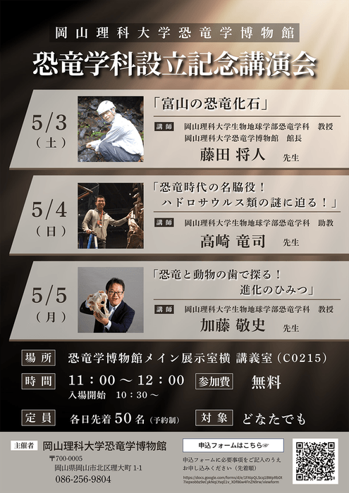 岡山理科大学に全国初の「恐竜学科」が誕生したのを記念して、親子で楽しめる講演会を開きます。講師は恐竜学科の新任教員3人です。当日は講演会に加え、恐竜学博物館の見学も楽しめます。大型連休は、岡山理科大学でワクワクする恐竜の世界を堪能してみませんか。