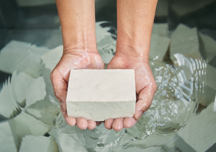 豆腐づくりには上質な水がかかせません。カンショクが現在の場所を拠点として豆腐づくりをつづけるのは、豆腐づくりに適した豊富で清らかな柞田川水系の伏流水の恵があるからこそ。昔から田畑や瀬戸内海を潤し、人々の健康を育んできたこの「伏流水」には豆腐づくりの大敵となる「鉄分」や「マンガン」がほとんど含まれておらず、厳格な水質管理・検査を行いながら、大豆を浸けることからはじまり豆腐を包む水まで日々、利用しています。