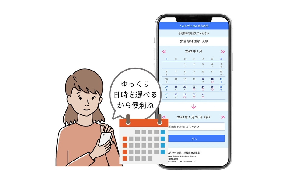 最終的には患者自身がスマートフォンで二次元コードを読み取って予約画面にアクセスして予約します。予約日時をその場で決める必要がないため、患者さんは余裕を持って予約できます。