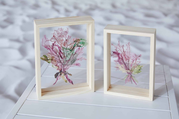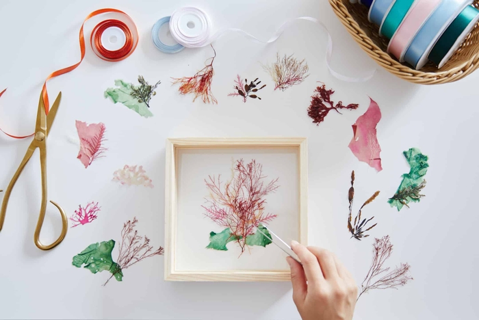 花束をウッドフレームに入れてインテリアとして楽しむ「フレームブーケ」をイメージし、色鮮やかで美しい海藻おしばを用いた「海の花フレームブーケ作り」を開催します。さまざまな色や形をしている海藻おしばから、自分好みのものを組み合わせて花束に見立て、ウッドフレームに入れると完成です。完成品は持ち帰り、花のように色鮮やかで美しい海藻をいつでも楽しむことができます。