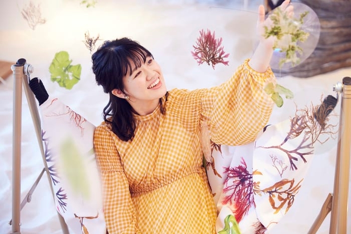 ソラノビーチ Books&Cafeの店内に、まるで海の中に咲く花のように色鮮やかで美しい本物の海藻を活かした装飾を設えます。今回は華やかな海藻の装飾を窓に設え、店内をさらに彩ります。天井からは、海の深さによって異なる色に育つ海藻の特徴になぞらえ、上部から緑色、褐色、紅色の海藻おしば(*1)を使用した「海の花モビール」が登場。また、最大約1メートルの高さの「海の花ハーバリウム」によって、本物の海藻の立体的な形の美しさを楽しめます。海藻がデザインされたハンモックに揺られながら、海の中でお花見をしているかのような気分を味わえる空間です。