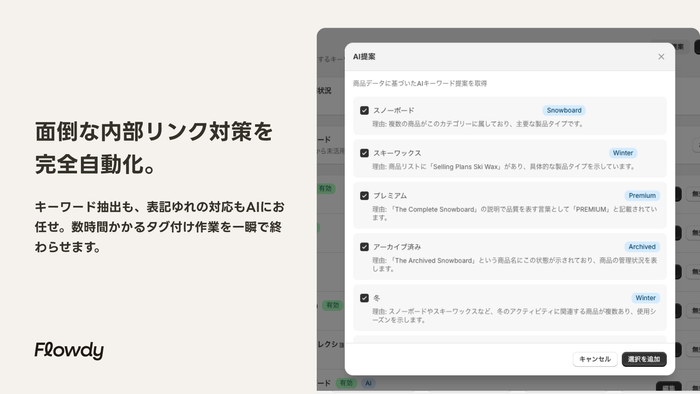 - AIが設定の手間を9割削減。面倒な内部リンク対策を完全自動化。