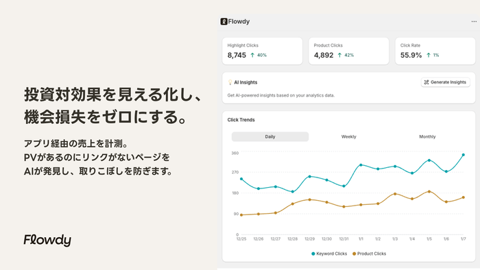 ユーザーがキーワードをクリックしてから7日以内に購入に至った売上を、「Flowdy経由の成果」として正確に計測・レポート化します。