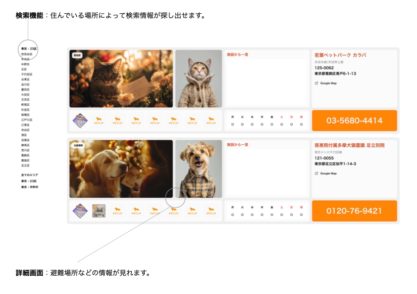 飼い主がスマホで迅速に葬儀施設の情報を確認できるように、住んでいる地域に応じた検索機能も備えています。シンプルな操作で詳細情報を閲覧できる仕組みや、施設の種類ごとに分類して探しやすくする機能も搭載。愛するペットとの別れの際に、落ち着いて施設選びができるようサポートします。