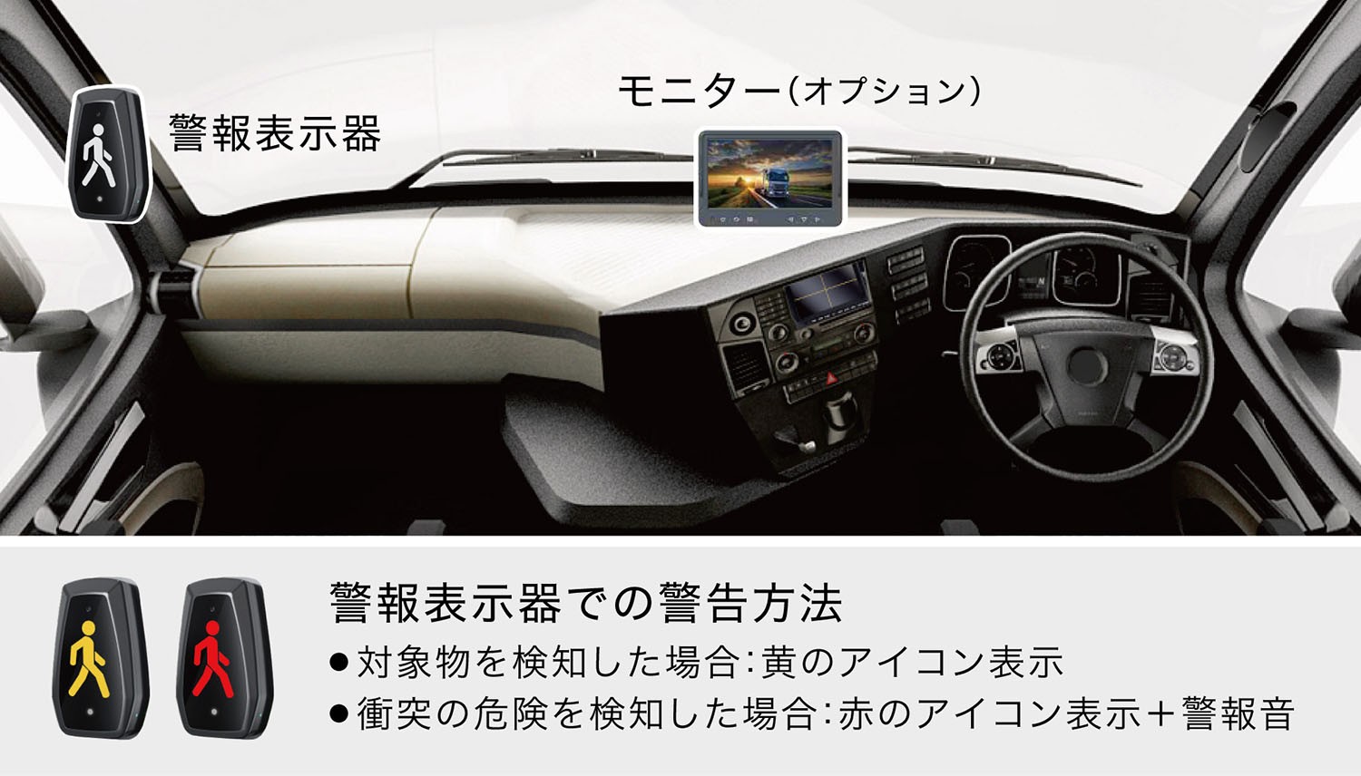 運行形態(都市部のルート配送/長距離輸送、市内路線/貸切観光など)によって、側方警報に求められる要件は異なります。C46は車両サイズや業種、運行環境に合わせて警報エリアの設定を変更(※2)できます。また、車両状況の視覚的な確認を容易にする車外表示モニター(オプション)も用意しています。
