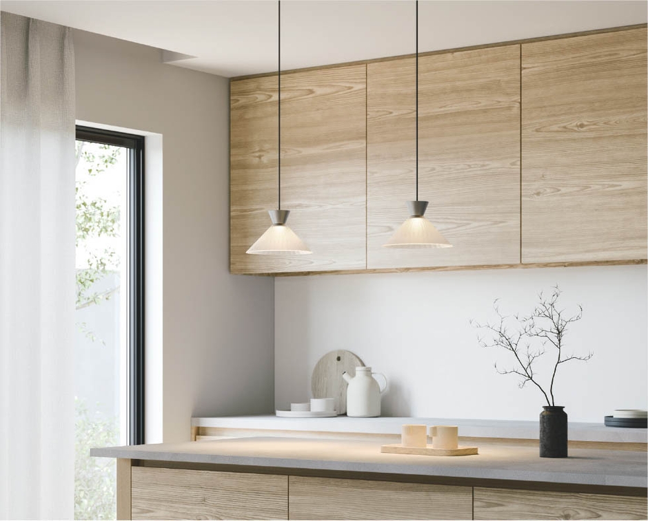 無垢材から削り出した木飾りとプリーツデザインの磁器セードを組み合わせたペンダントライトを8種ラインアップいたしました。磁器特有の優しい陰影と点灯感により、あたたかく落ち着いた雰囲気を演出します。また消灯時は、プリーツのくっきりとした陰影が見え、上品で繊細な印象を空間に与えることが出来ます。色温度は、2色(2700K電球色/3500K温白色)、飾り部分のカラーを2色(タモ、タモ・黒色塗装)ご用意し、お好みのインテリアや目的・用途に合わせてお選びいただけます。