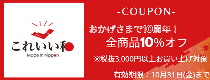 日本の伝統工芸品や日本のいいものを取り扱うブランド「これいい和」(運営:株式会社キャリアコンサルティング、所在地:東京都千代田区)は、創業10周年を記念し、日頃のご愛顧に感謝を込めた「第三弾!!10周年記念10%OFFキャンペーン」を期間限定で開催します。