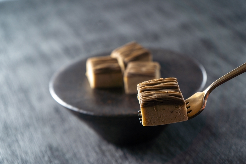 厳選した熊本県産の球磨の栗をふんだんに使った栗きんとんです。職人が心を込めて一つ一つ手作りしています。栗の風味と食感を残すために粗ごしした栗きんとんの上に繊細で滑らかな食感の1mmのほうじ茶ぺーストをふんだんにかけました。繊細な見た目にこだわり、口に入れると栗とほうじ茶の香ばしい香りが広がります。