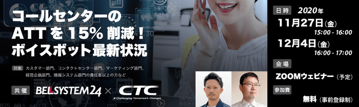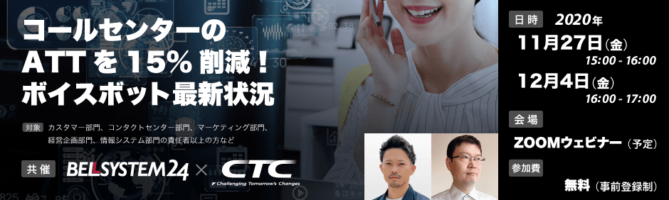 株式会社ベルシステム24(本社:東京都中央区、社長執行役員:野田 俊介、以下:当社)は、伊藤忠テクノソリューションズ株式会社(本社:東京都千代田区、代表取締役社長:柘植 一郎、以下:CTC)と共同で、VoiceBotの活用によるコールセンターの運用改善をテーマとして、「<ベルシステム24×CTC>コールセンターのATT*を15%削減!ボイスボット最新状況セミナー」と題したウェビナーを、11月27日、12月4日の二日間に亘って開催します。