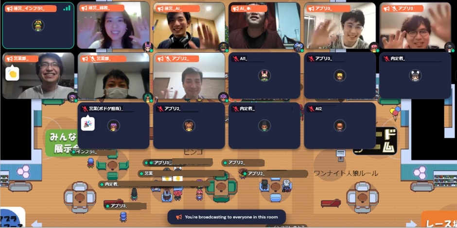 Gatherというバーチャル空間サービスを使用しました。アバターを操作しながら部屋を行き来したり、人に近づいて話しかけたりと、能動的に動けるので「忘年会に参加している」という実感が持てます。こちらは事前にアカウント作成などが不要で、アクセスURLとパスワードだけで、ふらっと参加することが可能です。