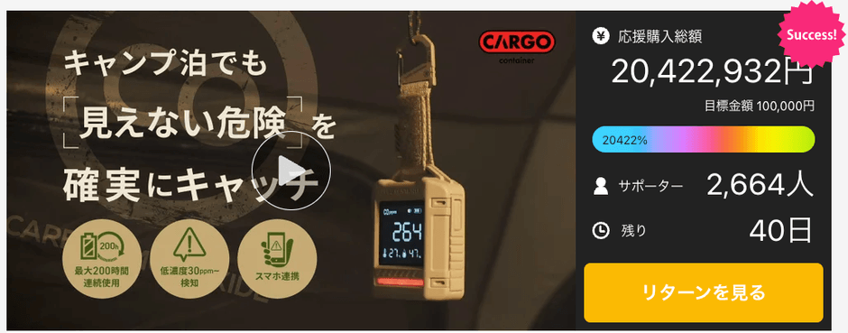 冬キャンプ泊の必需品! 一酸化炭素チェッカー「SAFE CO DETECTOR」 先行発売から1週間で応援購入総額2,000万円を突破!
