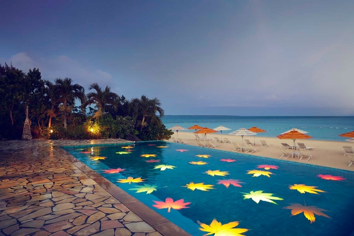 秋は木々の葉が色付き、紅葉を楽しめる季節です。当ホテルで、秋らしい体験を満喫していただきたく、ビーチサイドで紅葉狩り気分を味わえる、本イベントを考えました。ビーチサイドにあるプールには、紅葉の形をした色鮮やかな「紅葉ライト」が浮かび、プールの目の前のビーチにはオレンジ色のパラソルが並びます。プールからビーチまで紅葉カラーを眺められるため、その様子を「紅葉インフィニティ」と名付けました。南の島の静かな環境で、波の音に耳を傾けながら、秋色に染まるビーチサイドでのんびりと過ごせます。