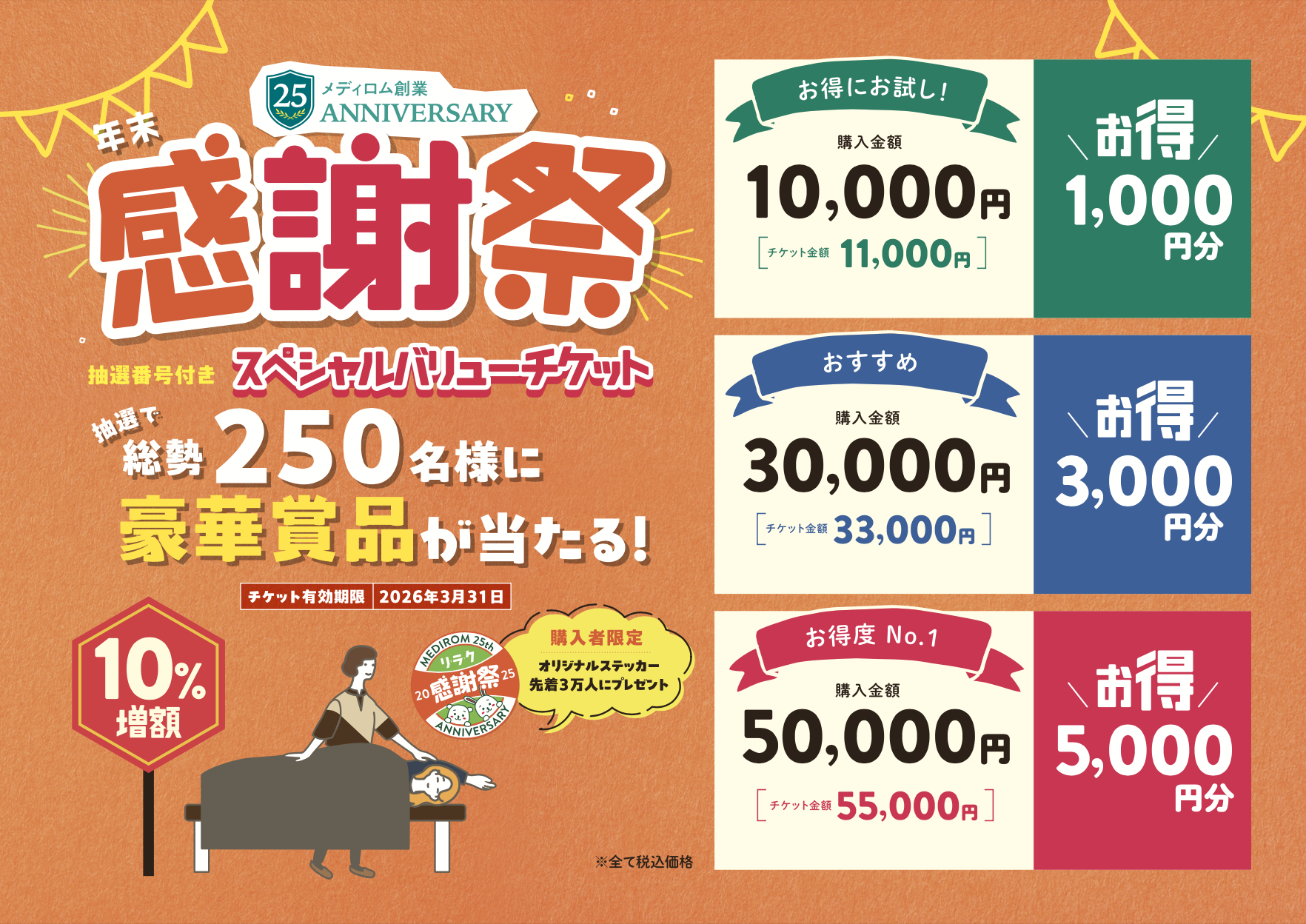 株式会社メディロム・ウェルネス(本社:東京都港区、代表取締役:江口 康二)は、日頃より Re.Ra.Ku グループをご愛顧いただいている皆さまへの感謝の気持ちを込めて、2025年12月1日(月)より、総勢250名様に豪華賞品が当たる「2025年 年末感謝祭」を開催いたします。