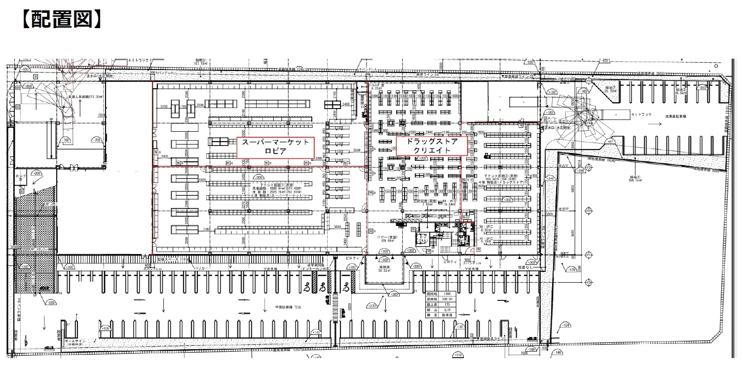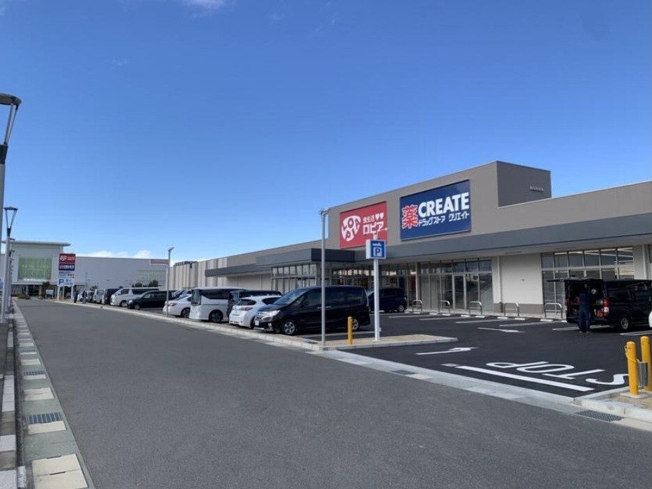 同施設は、市南西部の新たな拠点として発展を続ける、茶屋新田区画整理地内に整備され、敷地面積は8,432.55m2(2,550.84坪)となります。また、同整理地内のコンセプトの1つ、「自然と触れ合える良好な居住環境の形成」を踏襲し、敷地内や屋上などの緑化も積極的に取り入れた施設となります。建物は平屋建て+屋上駐車場となり、食生活♡♡ロピア、ドラッグストア クリエイトSDがオープンします。