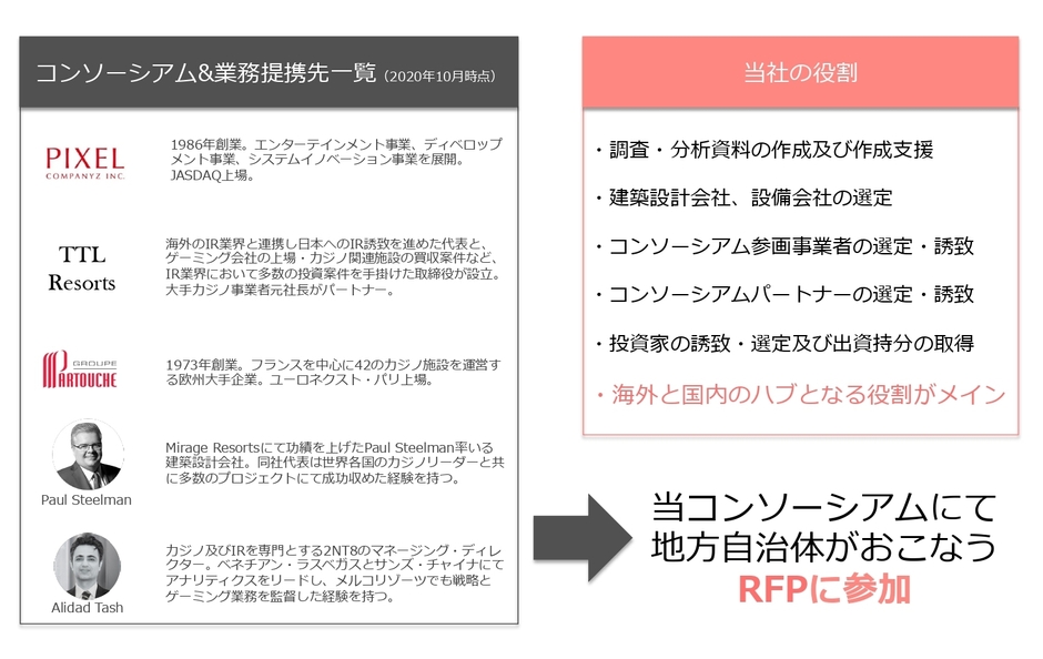 当社が参画するコンソーシアム及び、その業務提携先企業を含めた日本型IRプロジェクトメンバーには、海外のIR業界と連携し日本へのIR誘致を進めた経験を持つ代表と、ゲーミング会社の上場・カジノ関連施設の買収案件など、IR業界において多数の投資案件を手掛けた取締役が設立し、大手カジノ事業者の元社長をパートナーに持つTTLリゾーツ、欧州大手カジノ運営会社であるGroupe Partoucheがおります。