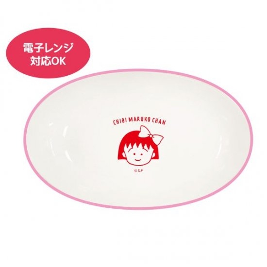 電子レンジ対応のパスタ&カリー皿もいかがでしょうか?真ん中にはまるちゃんのお顔、お皿は優しいピンクカラーで縁取られていてシンプルになりすぎない絶妙な素敵さ。このサイズの食器はなにかと活躍するアイテムです。サイズは17cm×27cm×6cm。