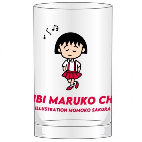 まずはカラフルなラインナップからピックアップ♪こちらはガラスで出来たグラスです。こちらの画像では鼻歌を歌いながらご機嫌なまるちゃんですが、グラスにはぐるっとデザインが入っているんです。このグラスでジュースを飲めばまるちゃん気分が味わえそうですね。