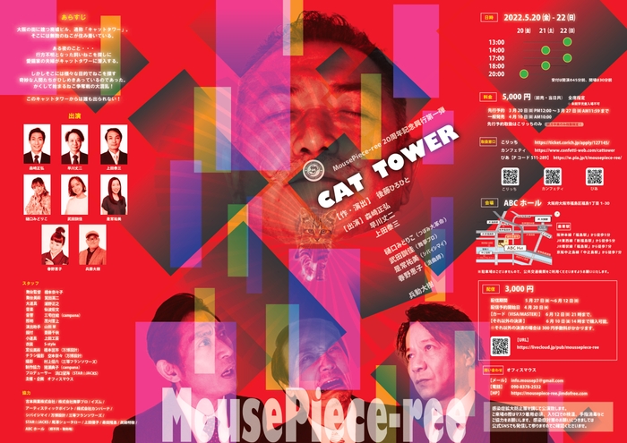 MousePiece-ree主催、MousePiece-ree20周年記念興行第一弾『CAT TOWER』が2022年5月20日 (金) ~2022年5月22日 (日)にABCホール(大阪府大阪市)にて上演されます。チケットはカンフェティ(運営:ロングランプランニング株式会社、東京都新宿区、代表取締役:榑松 大剛)にて4月10日(日)10:00より発売開始です。