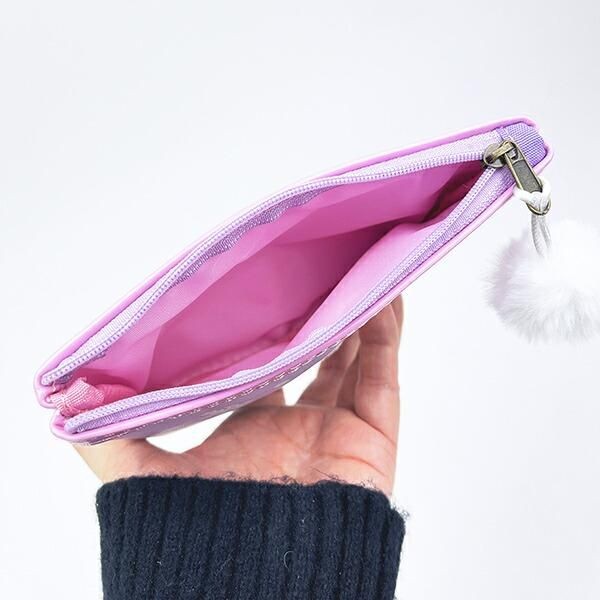 ちゃんとこちらも雪玉のところがふわふわのシープボアになっています。お色は優しいパステルパープル、ピンクでかわいすぎず、ナチュラルにかわいい印象です。よく見るとこちらには引手にファーのポンポンが付いています。ポーチのデザインに合わせた感じがどこからどこまでも愛らしすぎる、、!サイズ:13cm×17cm×1cm 素材:合成皮革