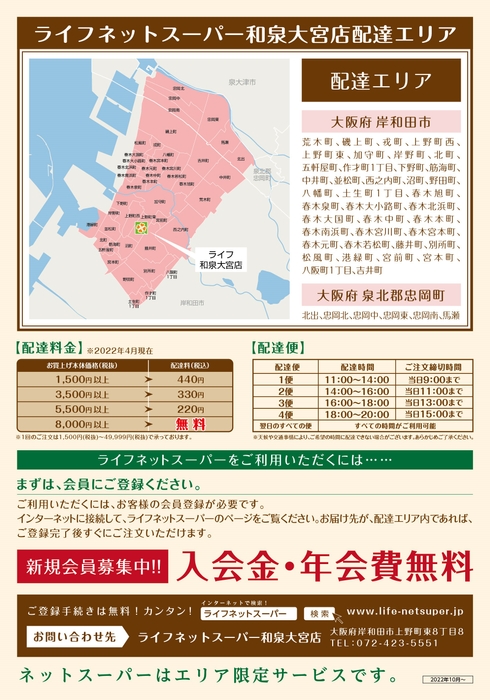 ご注文いただいた商品を店舗からご自宅へお届け「ライフネットスーパー和泉大宮店」サービス開始【岸和田市内の配達エリアを拡大、泉北郡忠岡町内の一部地域でもご利用可能に!