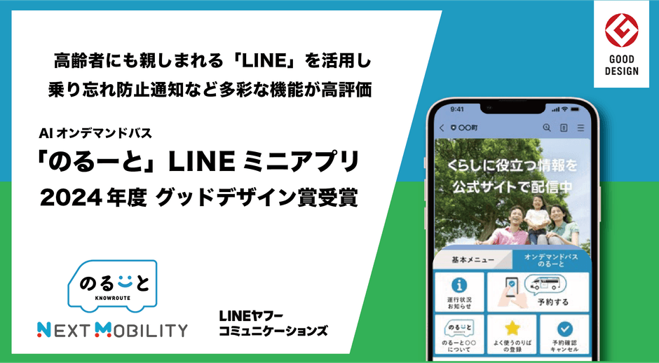 LINEヤフーコミュニケーションズ株式会社(本社:福岡市博多区、以下 当社)は、ネクスト・モビリティ株式会社(本社:福岡市博多区、以下 ネクスト・モビリティ)と、両社の協働施策として実現した、利用者がLINEで乗車予約できる「のるーと」LINEミニアプリにおいて2024年度グッドデザイン賞を受賞しました。