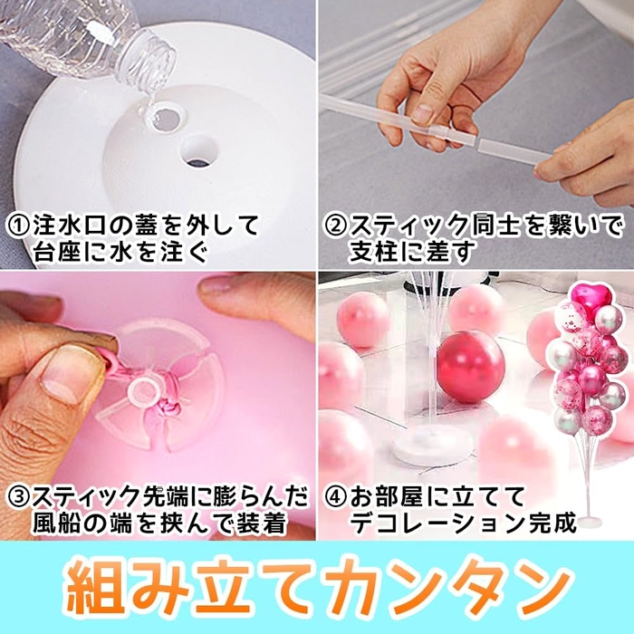 水を入れて重しにできる台座が付いており、人が通過した際の振動や風が吹いても倒れにくい安定感があるので設置場所を問いません。屋外のパーティーや撮影スポットとしても使いやすいです。組み立てに難しい工程や工具は一切使用不要!風船を膨らませたらスティック先端にある留め具に風船を括りつけるだけなので、短時間でデコレーションが完成します。