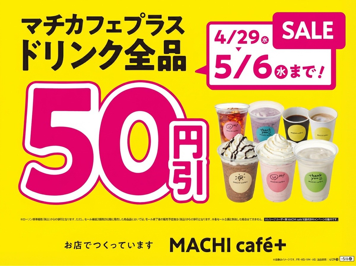 行楽や帰省など外出機会が増えるゴールデンウィークに、MACHI café+のドリンクメニューをお得に楽しめる、スペシャルセールを実施します。