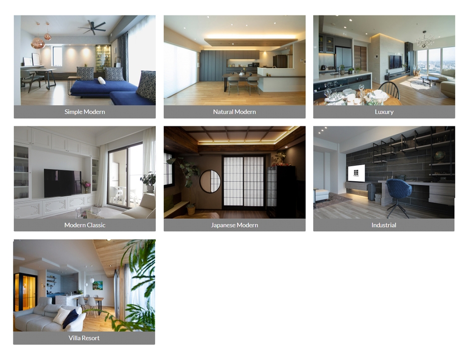 シンプルモダン、ナチュラルモダン、ラグジュアリー、モダンクラシック、和モダン、インダストリアル、ヴィラ・リゾートの7つのカテゴリで、テイストの違いを分かりやすく分類。