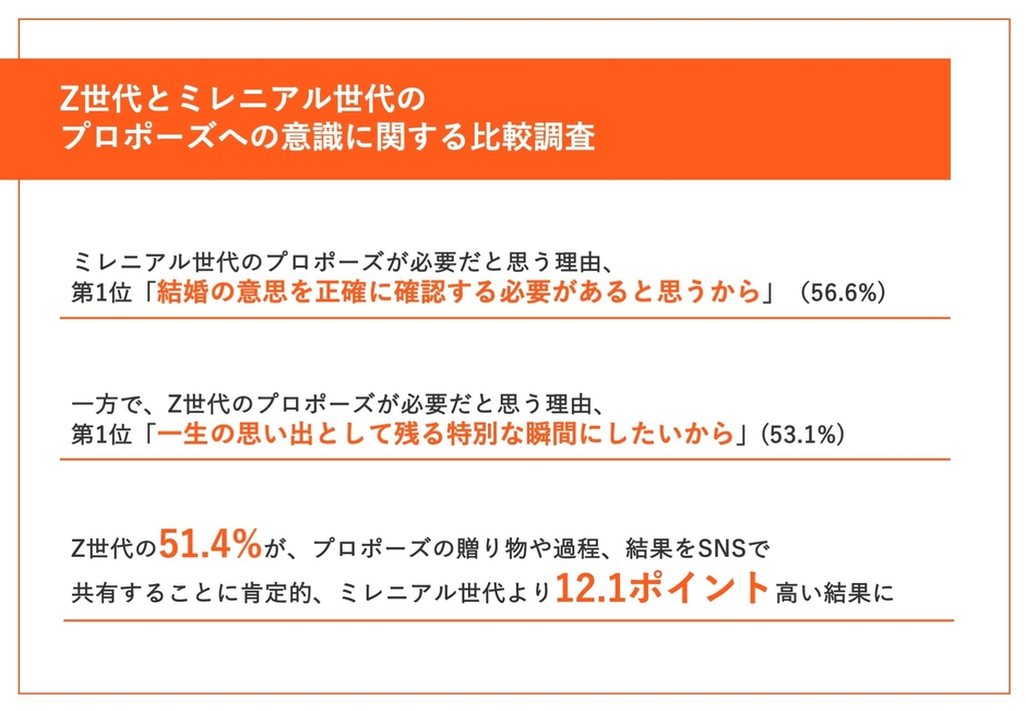 今回の調査では、Z世代とミレニアル世代のプロポーズへの意識の違いが明らかになりました。プロポーズに対して、Z世代は特別感を重視する一方で、ミレニアル世代はシンプルさを求める傾向があります。この背景には、デジタルネイティブ世代の価値観や社会的変化が影響しているのではないでしょうか。