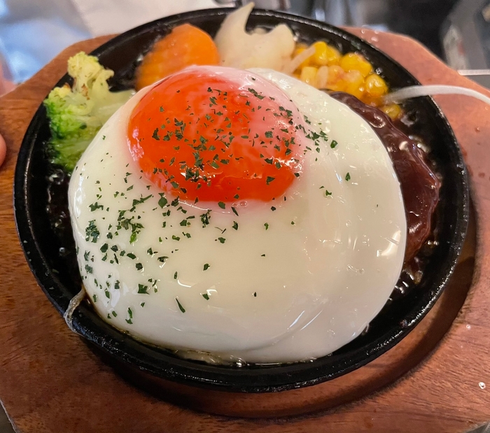 目玉焼きを乗せる事によりハンバーグのジューシーな脂と卵やチーズの