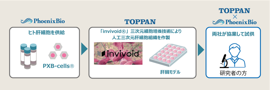 TOPPANホールディングスは、これまでに3D細胞培養技術「invivoid(R)」を大阪大学大学院工学研究科 松崎典弥教授と共同で開発しており、がん個別化医療、創薬研究、培養肉などに向けた研究を進めています。本業務提携により、TOPPANホールディングスの「invivoid(R)」とフェニックスバイオの新鮮ヒト肝細胞「PXB-cells(R)」を組み合わせた「人工三次元肝臓組織」(以下 肝臓モデル)について共同での試供を開始します。