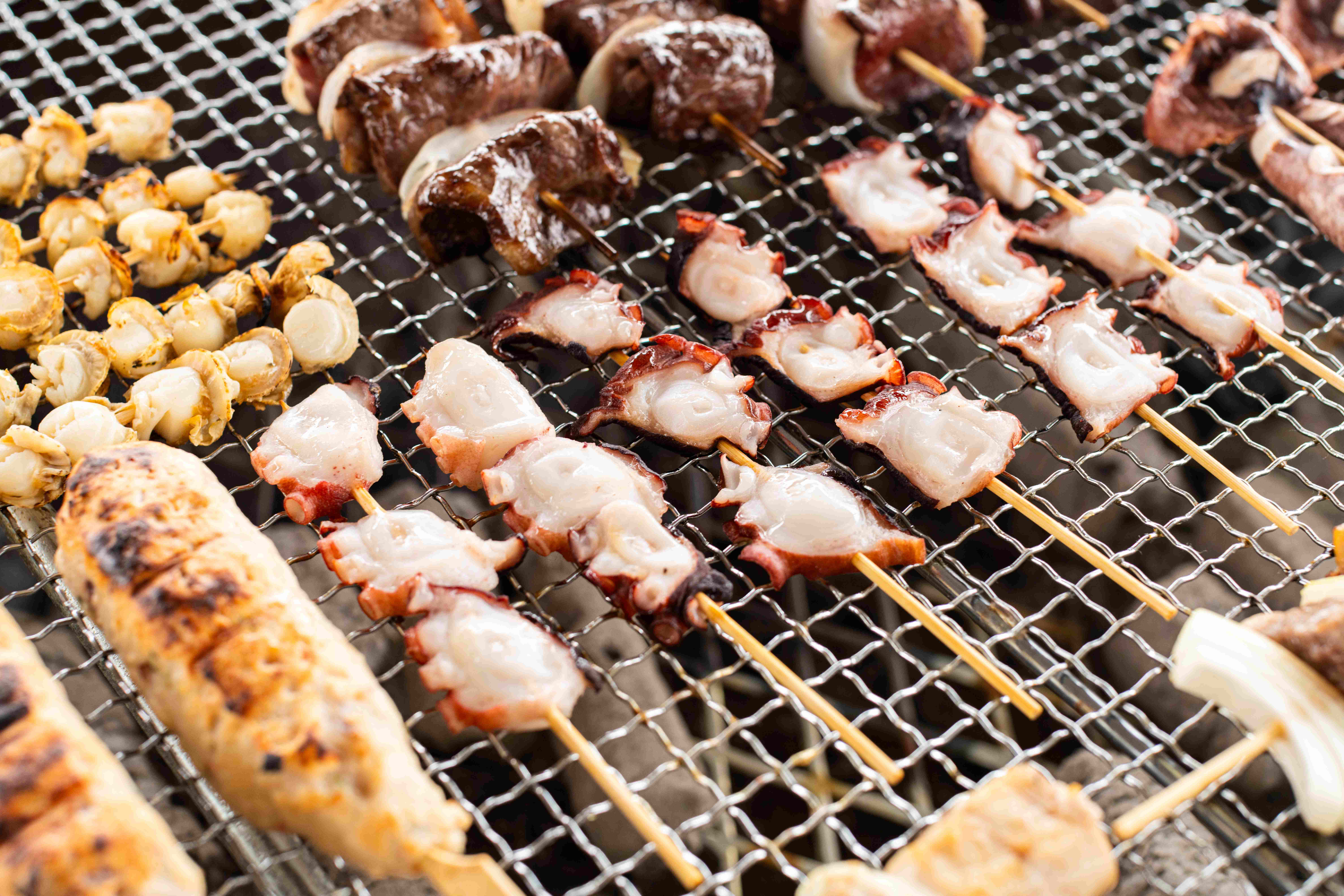 タコ串やイカ串、淡路牛串、焼き穴子を販売しております。