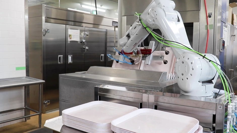 「crewbo トレイ system」は、厨房の洗い場で病院食のトレイや、社員食堂、テーマパークで提供される食事のトレイを洗浄するロボットです。展示機は埼玉医科大学病院で実際に食事提供に使用されるトレイ洗浄を行っているものです。今回は埼玉医科大学病院様、ホバート・ジャパン様のご協力の下、実機展示が実現いたしました。トレイ洗浄は1枚700グラムあるトレイを毎日4時間以上の時間をかけて洗浄する作業で、腕の力を必要とする過酷な業務です。「crewbo トレイ system」で厨房のワンオペ化を実現し、現場の生産性を向上しています。