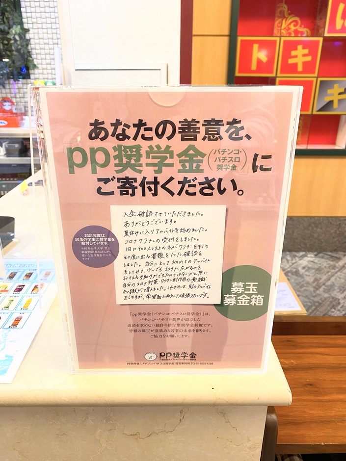 三恵観光株式会社(本社:京都府福知山市、代表取締役社長 兼 CEO:杉本 潤明)(以下、三恵観光)は、「pp奨学金(パチンコ・パチスロ奨学金)(以下「pp奨学金」)」の取り組みに参加するべく、2021年12月13日(月)から、同社が経営するパチンコ・スロット店「ダラム800」(京都府福知山市)、スロット専門店「ダラムS-1」(滋賀県大津市)に、募玉募金箱を設置いたしました。