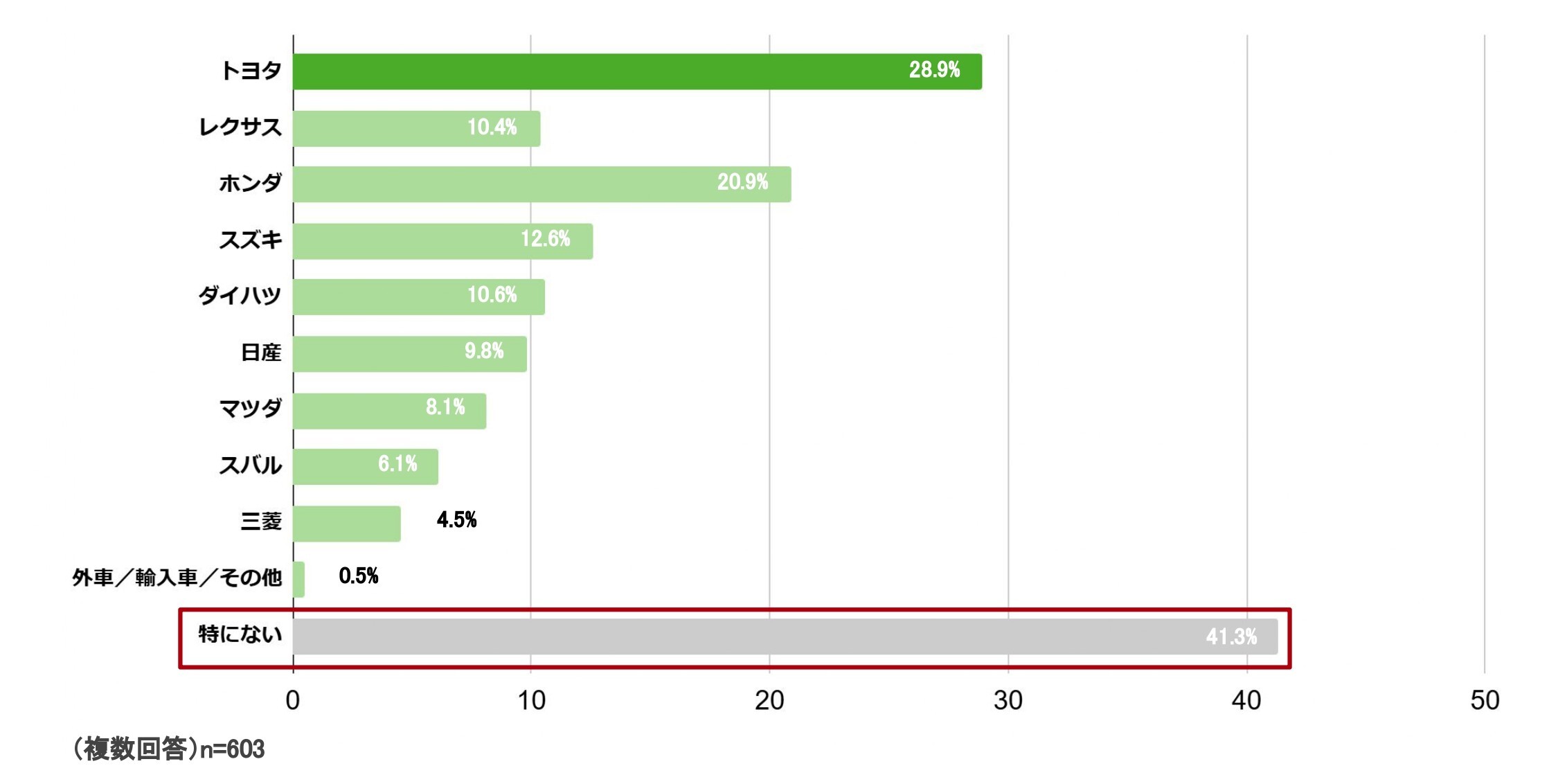 好きな自動車メーカー・ブランドを尋ねたところ、最も多かったのは「トヨタ」(28.9%)で、約3割の若者が支持しました。続いて「ホンダ」(20.9%)、「スズキ」(12.6%)、「ダイハツ」(10.6%)が上位に入りました。一方で「特にない」と答えた人も41.3%と4割を超えており、ブランドへのこだわりが強い層と無関心層に二極化している実態が浮き彫りになりました。