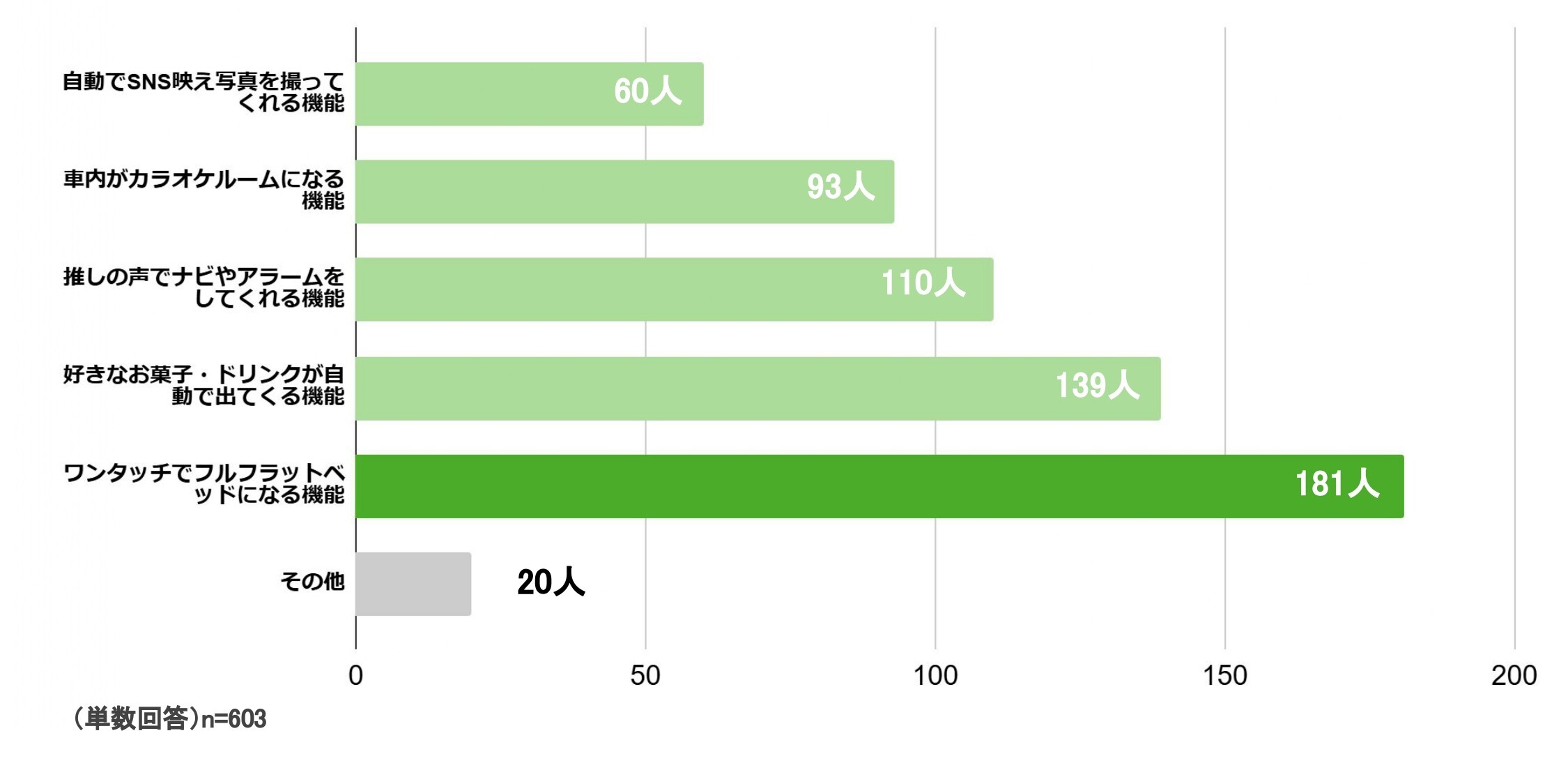 調査の結果、車に追加したい“夢の機能”として最も多かったのは「ワンタッチでフルフラットベッドになる機能」(30%)でした。次いで「好きなお菓子・ドリンクが自動で出てくる機能」(23.1%)、「推しの声でナビやアラームをしてくれる機能」(18.2%)が続きました。移動手段としての車だけでなく、“快適さ”や“推し活”などライフスタイルを充実させる機能が求められていることがうかがえます。