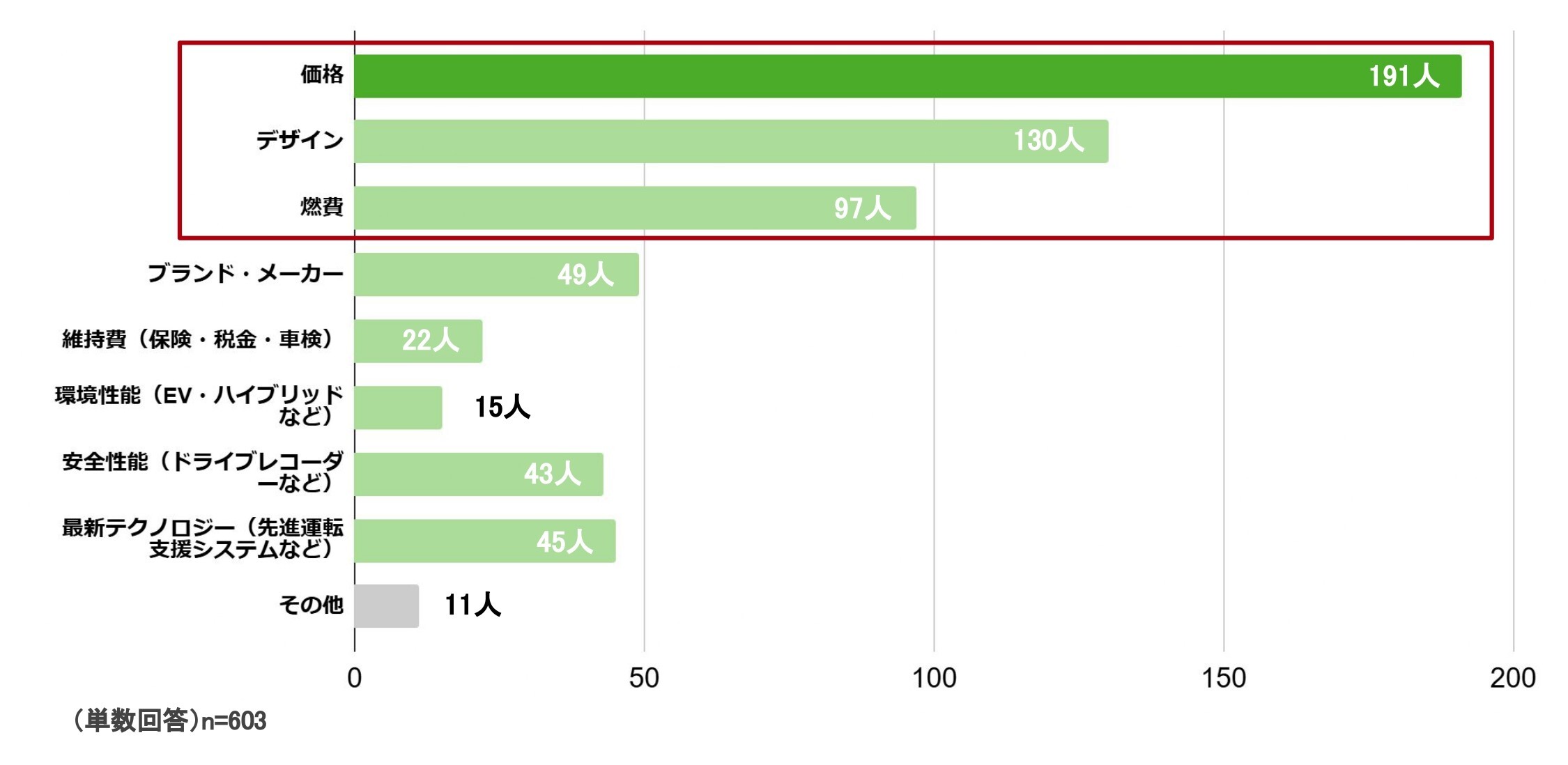 調査によると、車を選ぶ際に最も重視するポイントとして「価格」を挙げた人が191人(31.7%)でトップとなりました。次いで「デザイン」130人(21.6%)、「燃費」97人(16.1%)が続き、「ブランド・メーカー」や「最新テクノロジー」を選ぶ人は1桁%台にとどまりました。若者の車選びは“現実重視”の傾向が強いことが浮き彫りになりました。