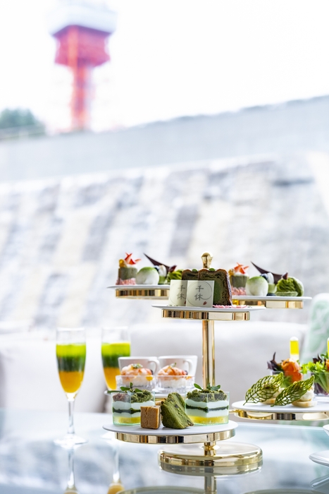 スイーツは、ホテル特製シャインマスカットのレーズンバターをサンドした「千休 米粉の抹茶フィナンシェサンド」や、濃厚な抹茶を感じられる「お抹茶チーズケーキ」、抹茶を練り込んだ白あんとレモンのマーマレードを求肥で包んだ「お抹茶大福」など計7種。