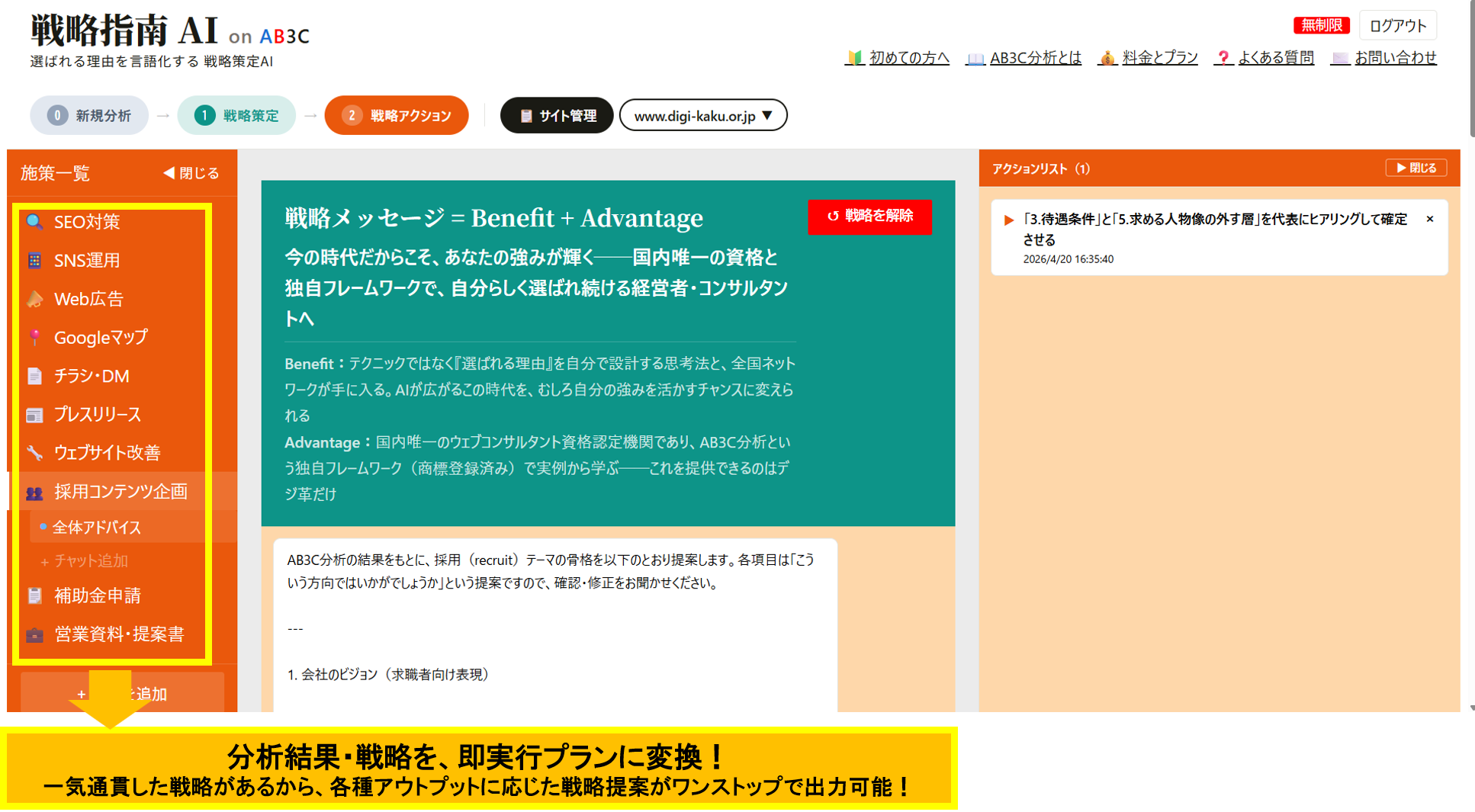 「戦略指南AI」は、WebサイトのURLから「事業戦略分析」「WEB改善レポート」を即座に出力。また、戦略指南プランでは、「提案書作成」「補助金獲得に向けた戦略策定」「採用コンテンツ企画」など、企業の各部門での施策への落とし込みが可能です。