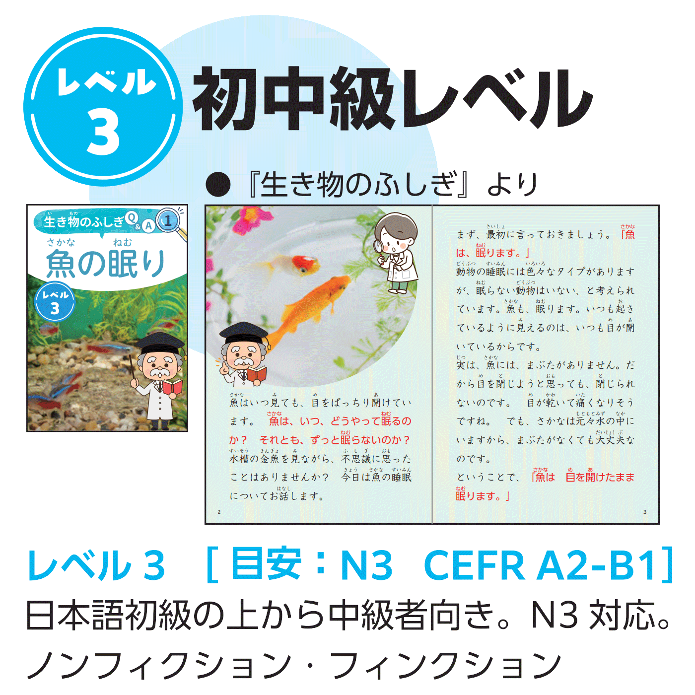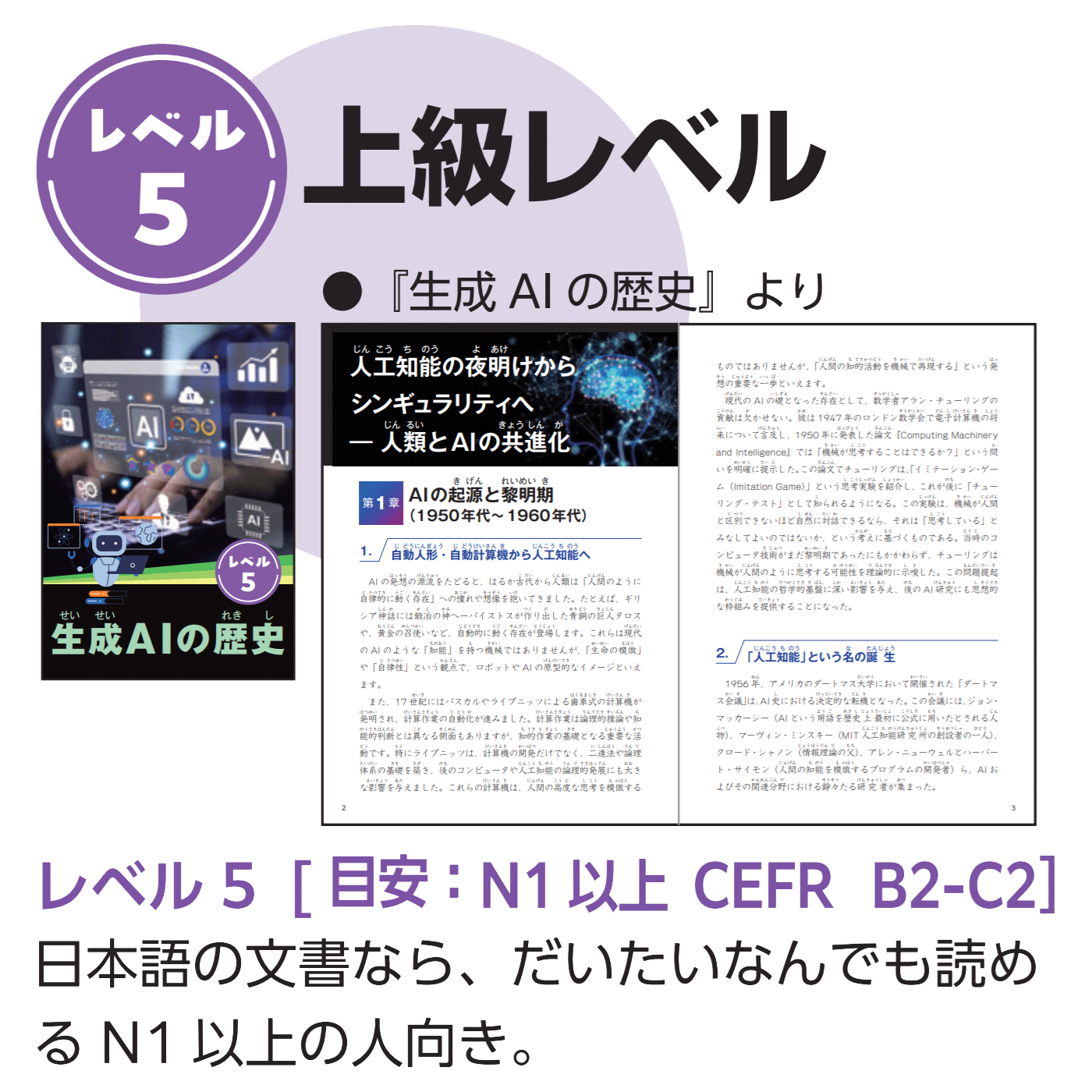 (1)初級者~上級者まで、すべてのレベルに対応:6段階のリーダー(日本語能力試験 N5未満、N5~N1に対応)を用意!