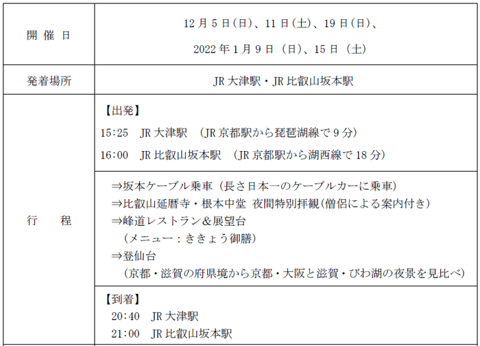 - JR大津駅発着版「冬の比叡山プレミアムナイトバスツアー」の概要(江若交通主催)