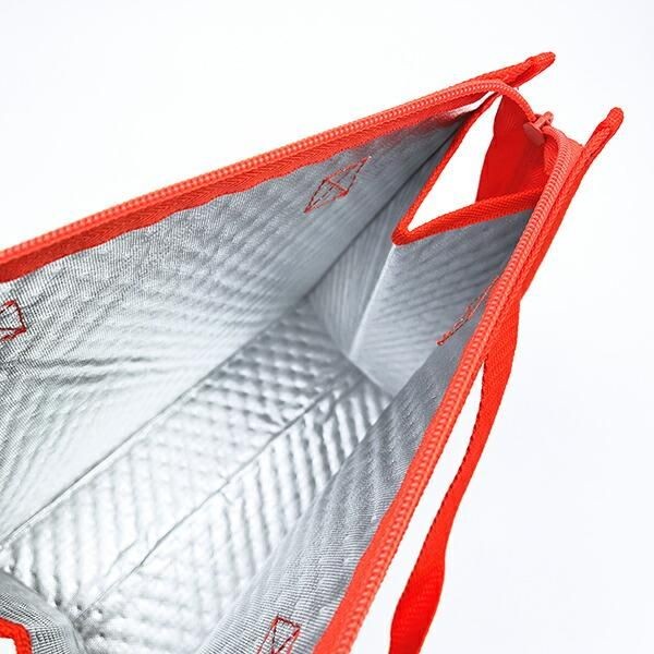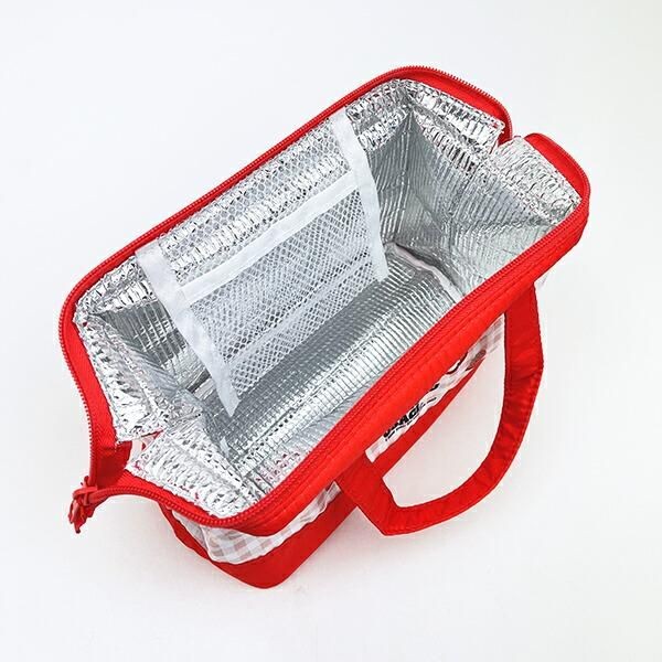 内側がアルミ蒸着仕様で保冷剤などを入れられるメッシュポケットが付いているのも嬉しいポイント!