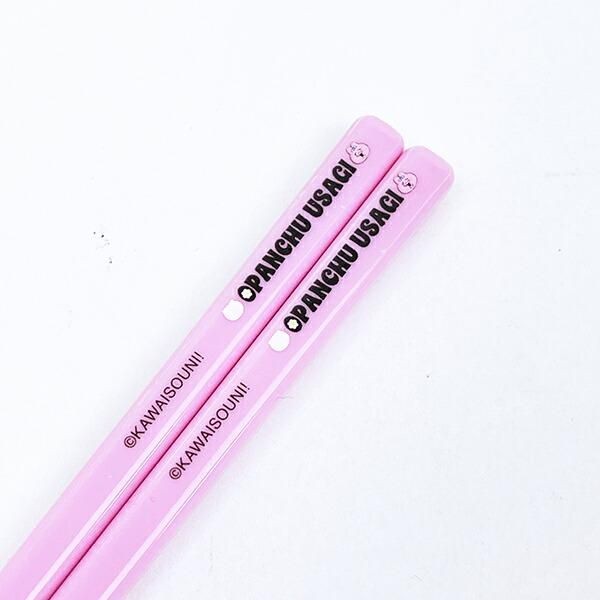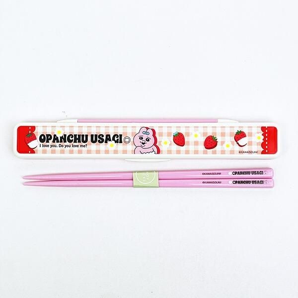 「音の鳴らない箸・箸箱セット(18cm)」もラインナップ。いちご柄のケースとピンクのお箸に、ワンポイントであしらわれたおぱんちゅうさぎにときめきます!