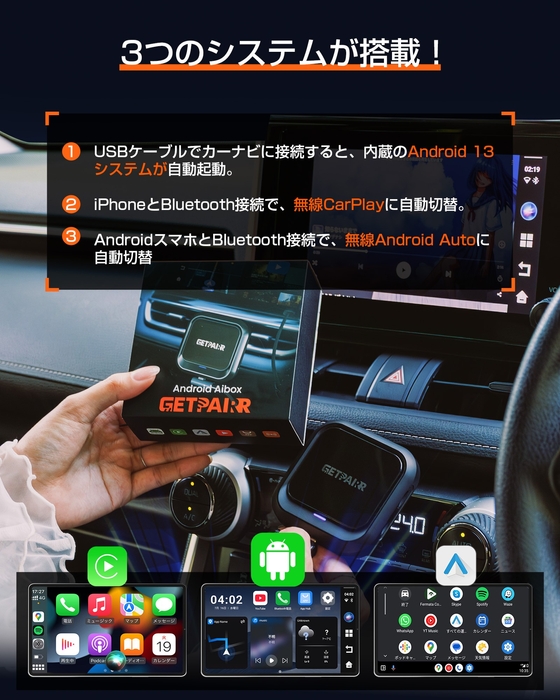 Android 13システム+有線CarPlay/Android Autoをワイヤレス化。