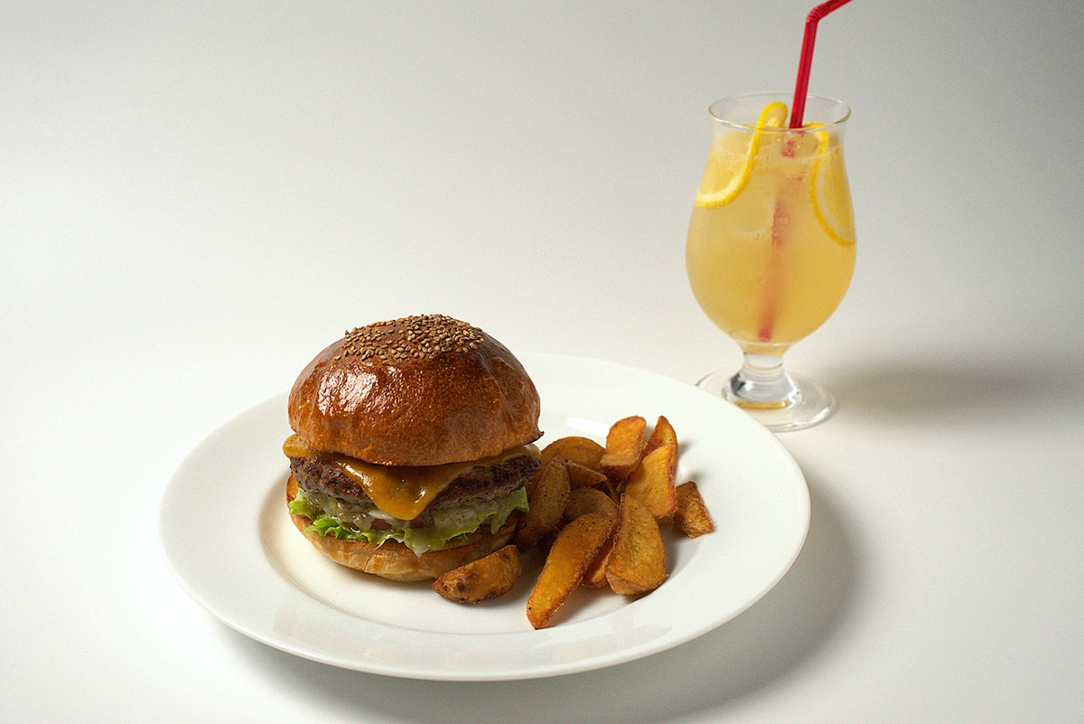 つなぎなし牛100%のパティに濃厚なチェダーチーズを重ねた、満足感たっぷりのチーズバーガー。ドリンクは、生搾りレモンと種子島産サトウキビの自家製シロップで作るレモンスカッシュ、または青森産りんごと自家製ジンジャーシロップを使ったアップルジンジャーエールから選べます。