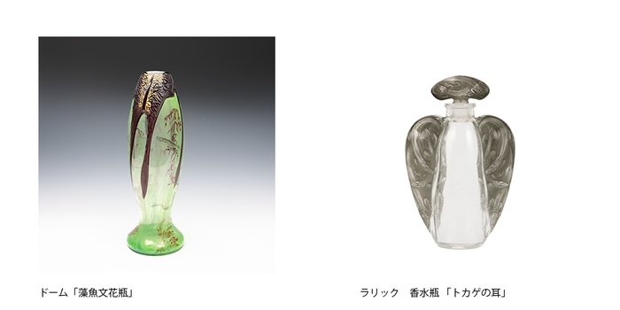 ■西洋美術からは、北澤美術館にも同意匠作品が所蔵されているドームの「藻魚文花瓶」や、オークション市場に出回るのが非常に珍しいラリックの香水瓶「トカゲの耳」などをはじめとした、貴重なアール・ヌーヴォーのガラス作品が並びます。その他ラウル・ラルシュ「ロイ・フラー」やKPM ベルリンの陶板画にも注目です。